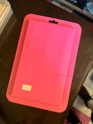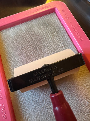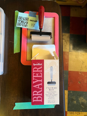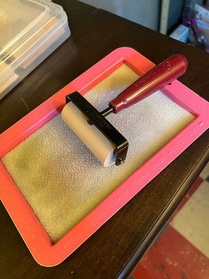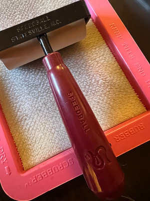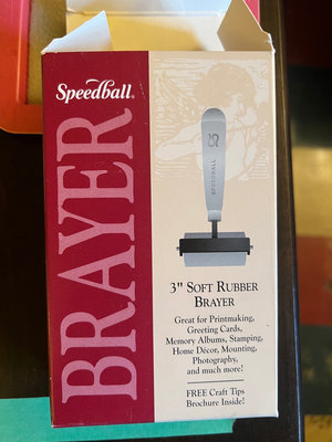 A 3-inch soft rubber brayer from Speedball with red handle and black frame, white roller, in a pink brayer tray and its original box.
