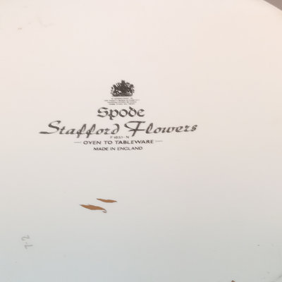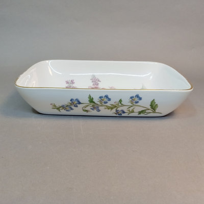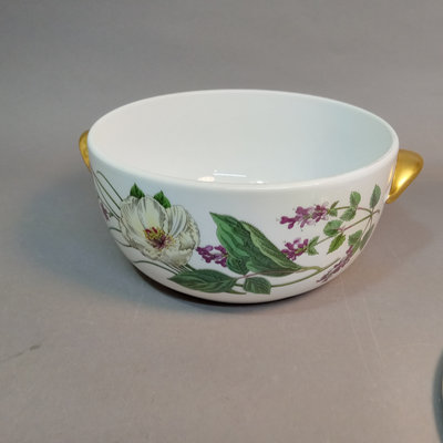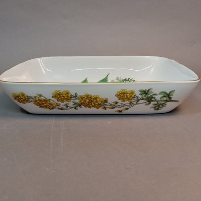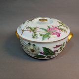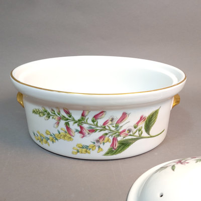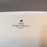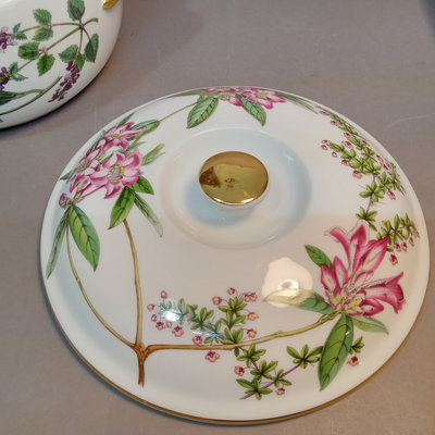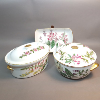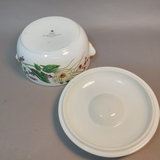 Spode Saffron Flowers pattern with pink flowers, made in England. Serving dish, 6.75x10.25. Covered oval dish, 10.25x7.75x6.5. Round covered dish, 8.5d x 6h. 3 pieces.