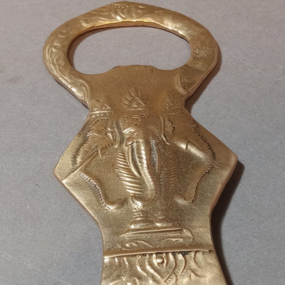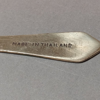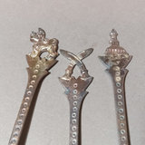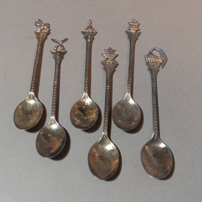 Set of plated and enameled tea spoons, made in Thailand. Plated bottle opener. Set of plated demitasse spoons with different figures at end of each handle. 13 pieces.