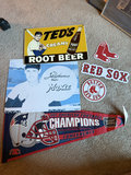 A collection of sports-themed decor and advertising signs, including a Ted's Creamy Root Beer sign, Red Sox magnets and beer-themed wall decor, a Boston Patriots conference pennant, and other related metal and wall decor items, accompanied by a handwritten inventory note. 3 red sox magnets, 1 penant, 10x15 and 12x16 metal wall decor
