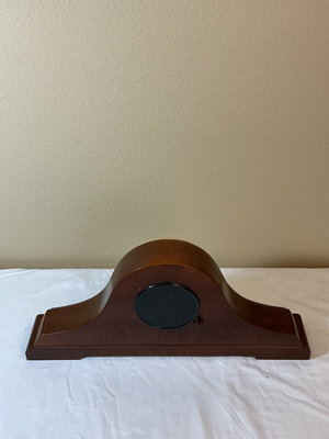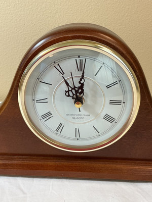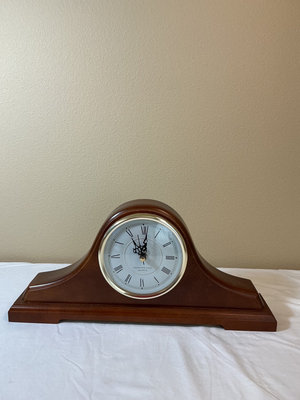 A wooden mantel clock accompanied by a collection of vintage classic literature volumes, including Pride and Prejudice, Jane Eyre, The Way of All Flesh, and Geoffrey Chaucer's Complete Works.