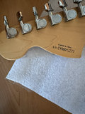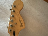 A sunburst Squier by Fender Stratocaster electric guitar featuring a cream pickguard, three single-coil pickups, a chrome synchronized tremolo bridge, volume and two tone controls, and a white back plate, accompanied by a black gig bag.