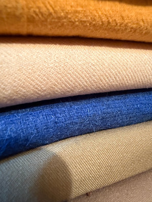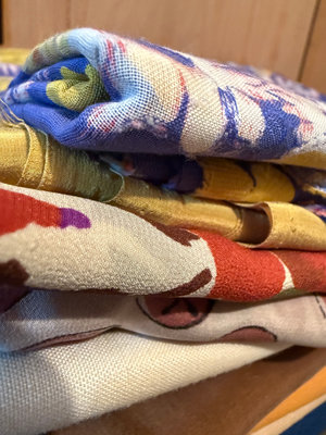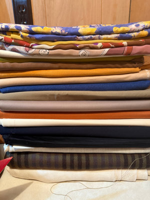 A collection of assorted folded fabrics in multiple colors and patterns, including floral prints and solid neutrals. ** BRING OWN PACKING MATERIALS
