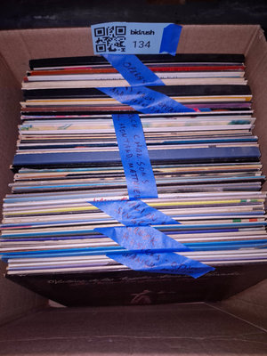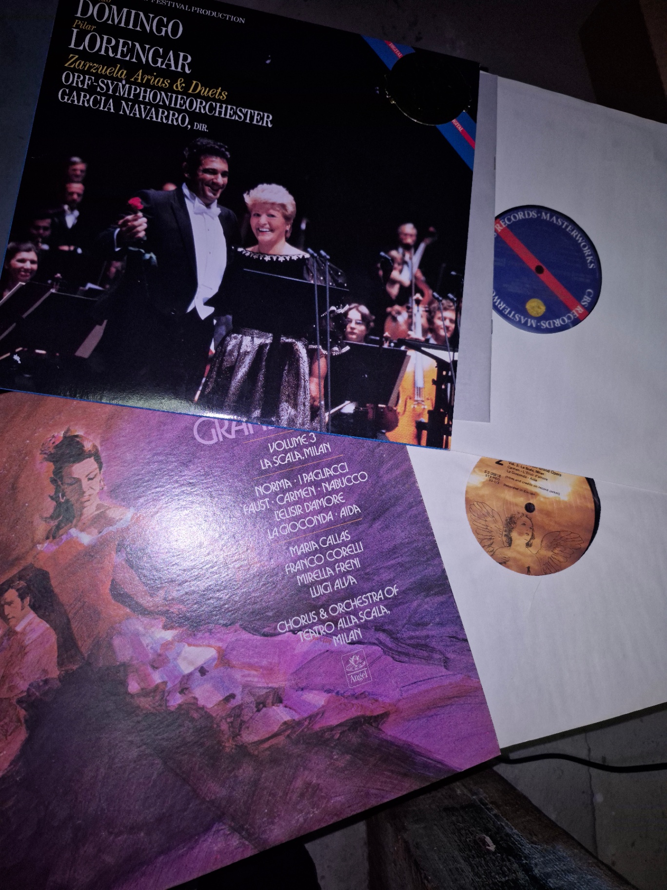 A box of stacked vinyl records. Operas, Chansons, Italian, Greek. Domingo Lorengar ** BRING HELP TO MOVE OUT OF BASEMENT