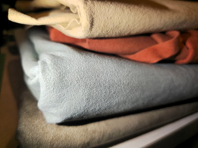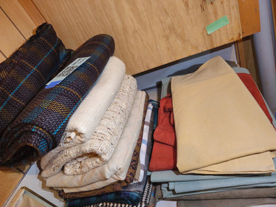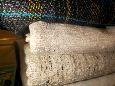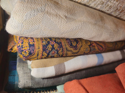 A stack of folded textiles including blankets, throws, and woven fabrics in various colors and patterns, arranged together. ** BRING OWN PACKING MATERIALS