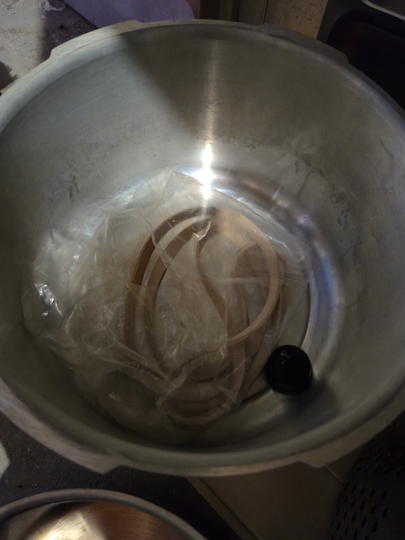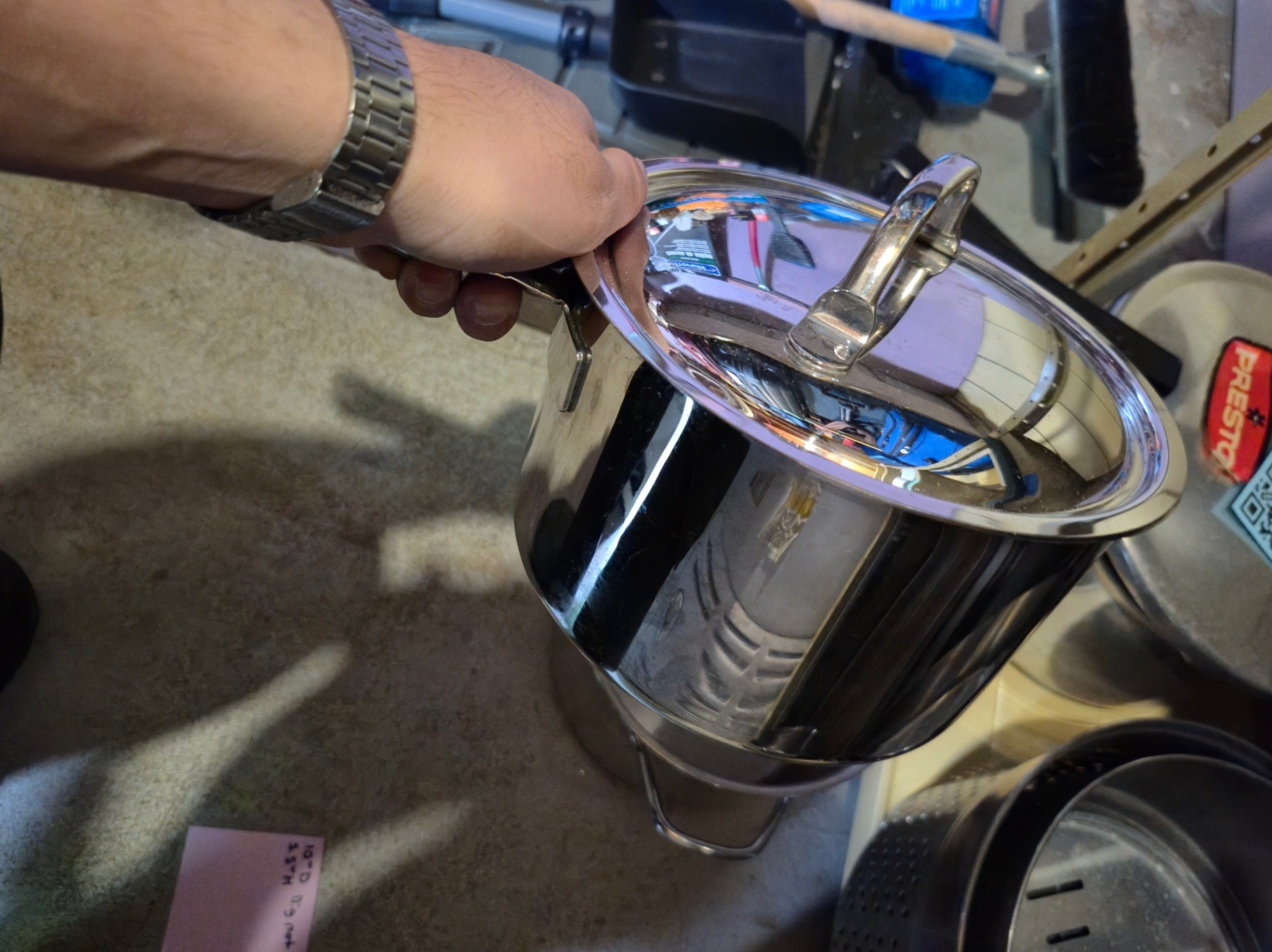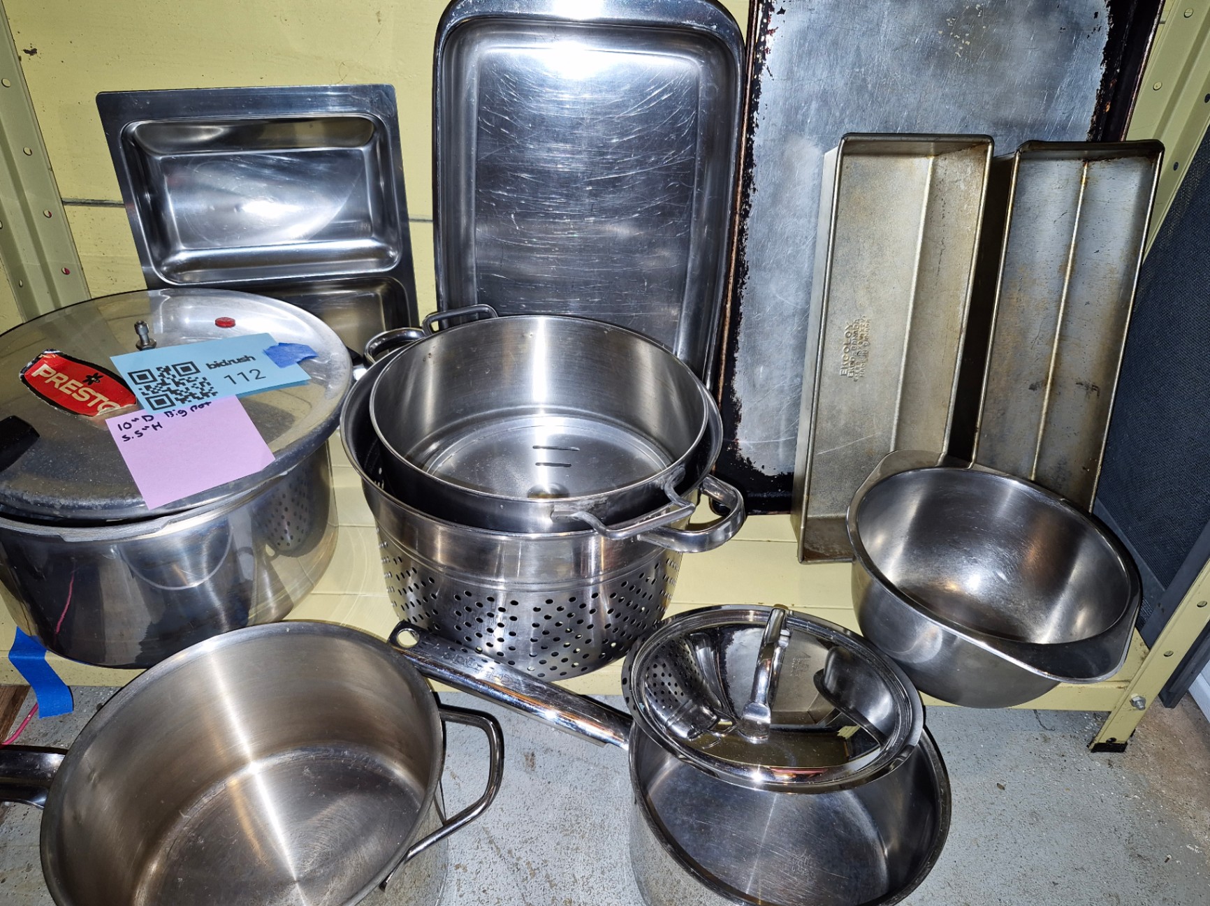 A collection of stainless steel kitchenware including pots with lids, a steamer basket, perforated insert, rectangular loaf pans, and a pressure cooker lid. **BRING OWN PACKING MATERIALS