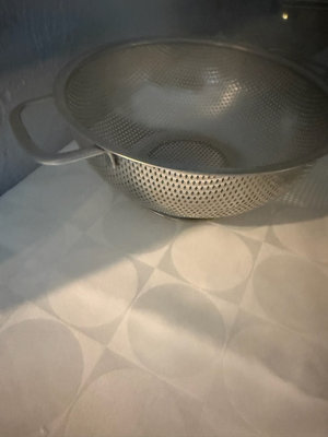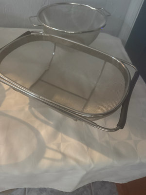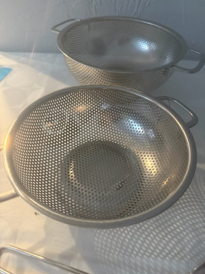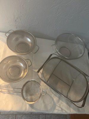 A collection of stainless steel perforated kitchen strainers and colanders, including round and oval shapes and a rectangular mesh draining basket.
