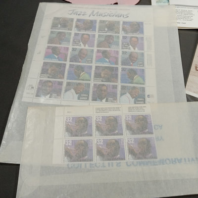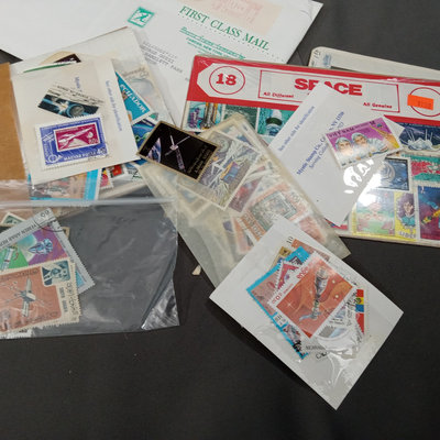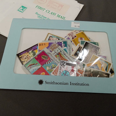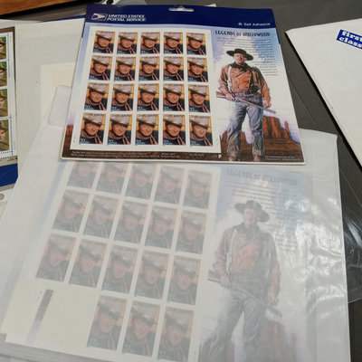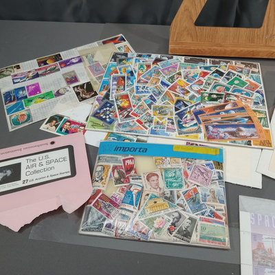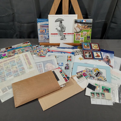 Pushing the Envelope softcover book on Stamp Collecting. Sheets and singles, collections from the Smithsonian Museum, first day covers, post card booklets, cancelled and unused, on Space, Movie greats, Baseball, and more. 100 plus pieces.