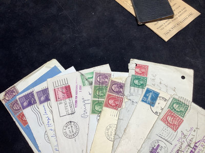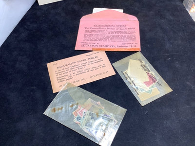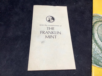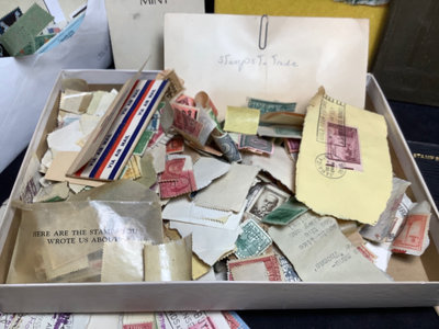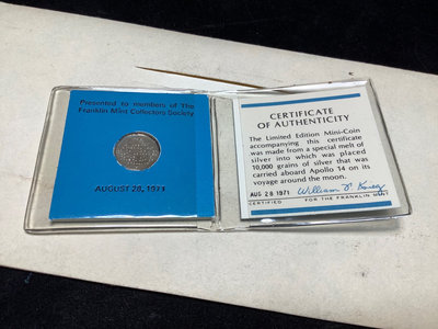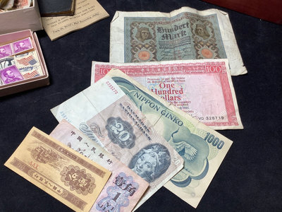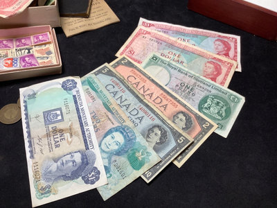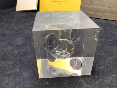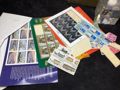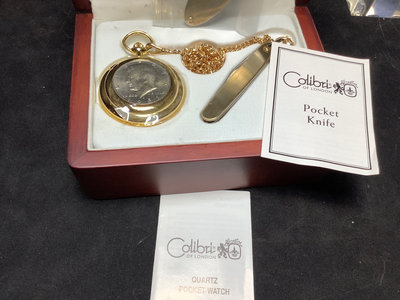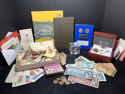 Unsorted box of cancelled and uncirculated stamps. US Mints book from 1897. Colibri JFK pocket watch and pocket knife set, new unused condition. JFK bicentennial coin gold set in display stand. Franklin Mint special melt mini-coin made with silver that was carried on the Apollo 14. Older paper money and coins from around the world. 10 plus pieces.