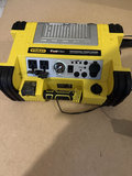 A yellow Stanley FatMax portable power station with dual outlets, built-in gauge, control knobs, and attached red and black jumper clamps.