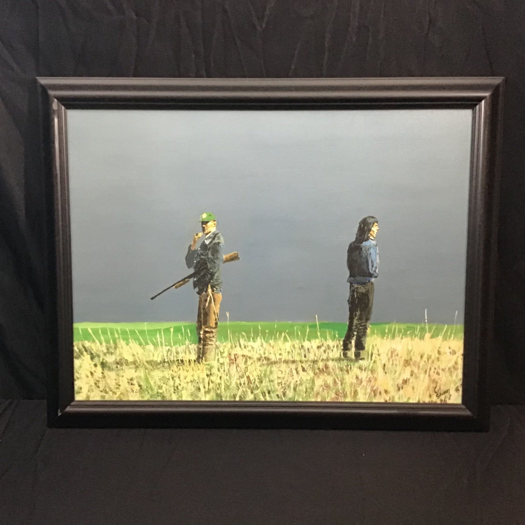 Untitled paint on canvas, signed bottom right Gil Stanley, damage/chips to frame in several places. Art 18x24, frame 21x27. 1 piece.