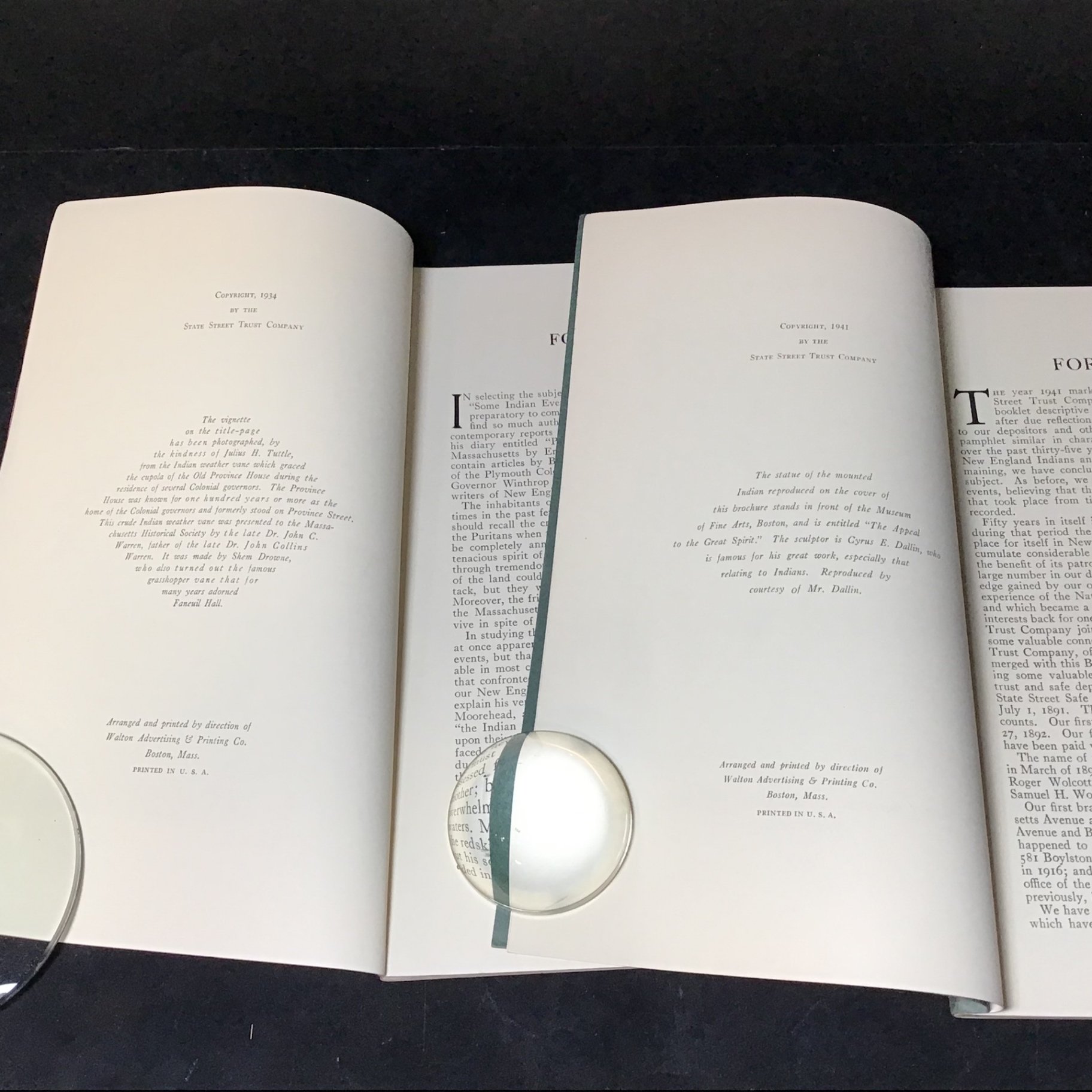 Vintage booklets published and distributed by State Street Trust Company, featuring information about Ship Sailing Cards, Boston Statues, Native American Events in the Boston area. Copyright 1934, 1941, 1946, 1947, 1948. 6 pieces.