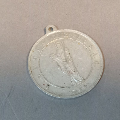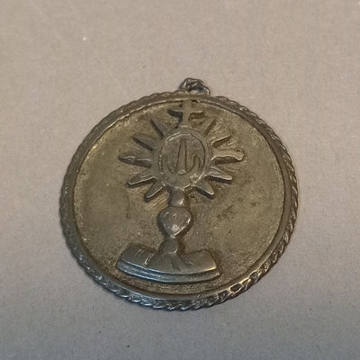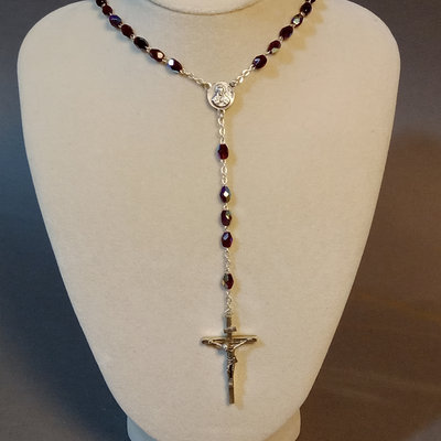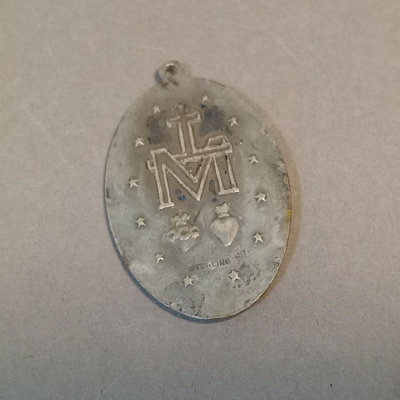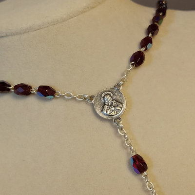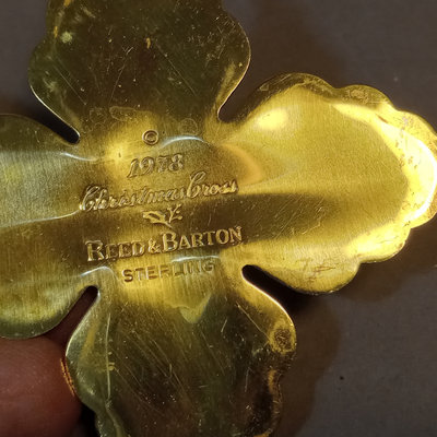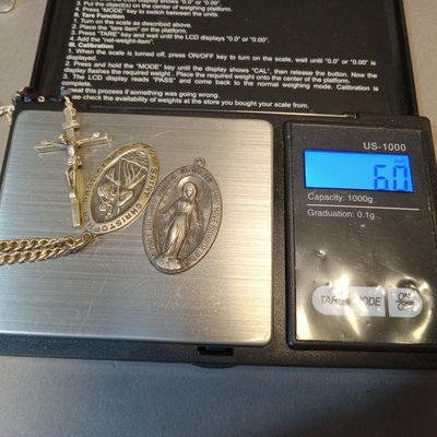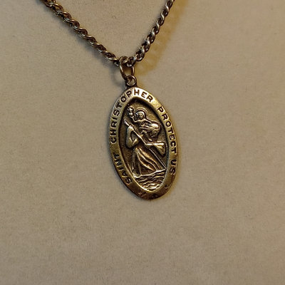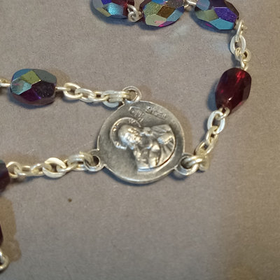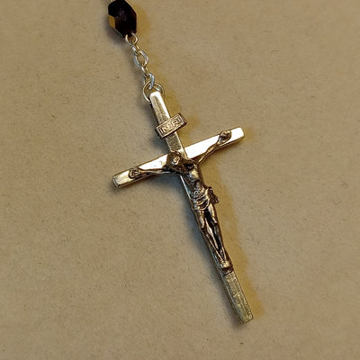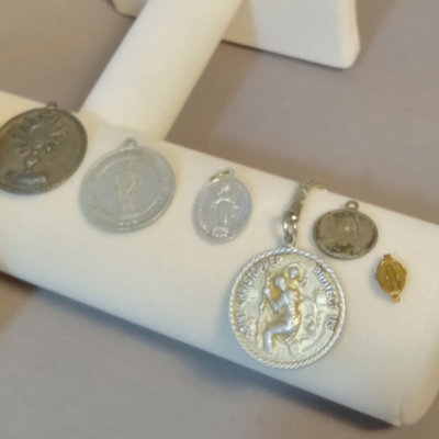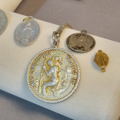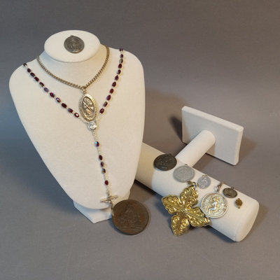 Reed & Barton Sterling Christmas Cross 1978, 9.7dwt. 24in chain with sterling St. Christopher medallion, sterling and faceted stone rosary, sterling Virgin Mary pendant, overall 9.4dwt. Other coins and medallions. 11 pieces.