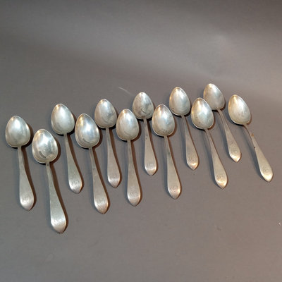 Antique Dominick & Haff (1868-1928, then absorbed into Reed & Barton) Sterling Pointed Antique pattern set/12 dessert spoons, 7in, overall weight 359.0dwt. From Shreve, Crump, & Low. Companion pieces to Lots 444-445, 447-454. Monogram on handles. 12 pieces.