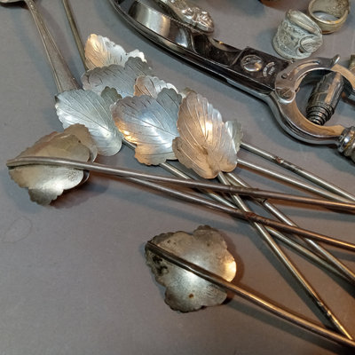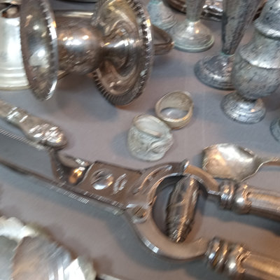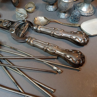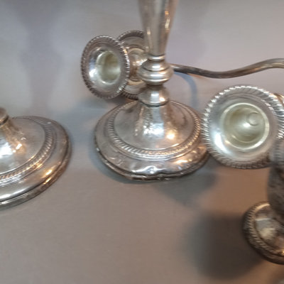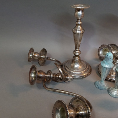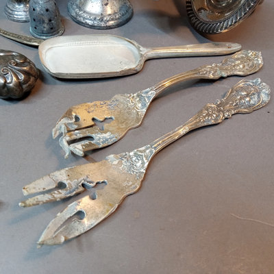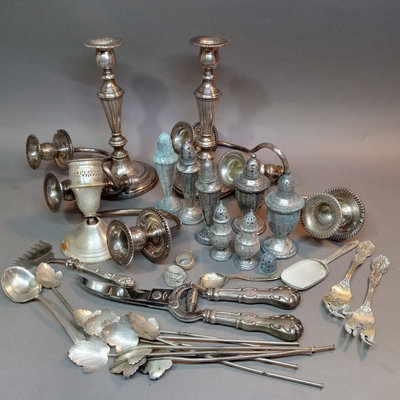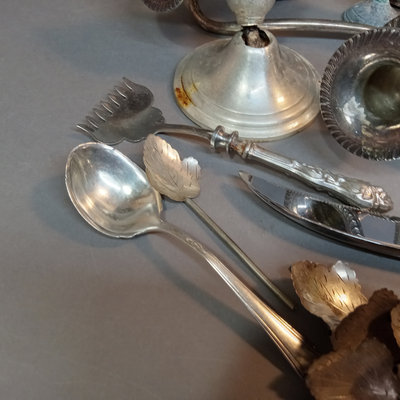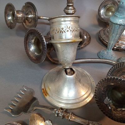 Weighted candlesticks and shakers, flatware that looks like it went through the dishwasher, iced tea spoons, and more. 20 plus pieces.