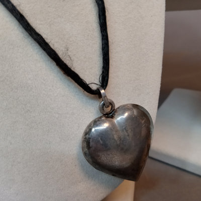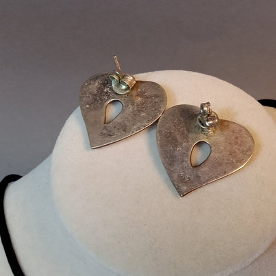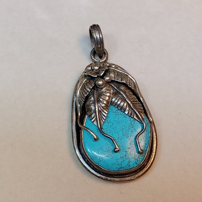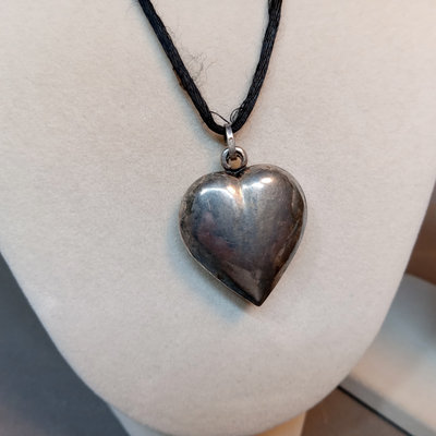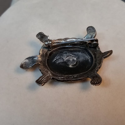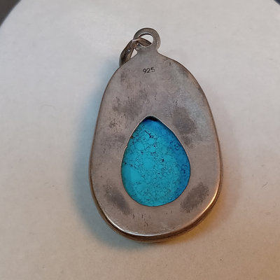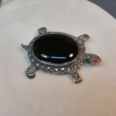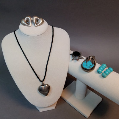 Hollow heart pendant on black cord, hollow heart earrings, 925. Large pendant, turquoise and sterling stamped. Turquoise drop earrings. Marcasite and onyx turtle, marked sterling. 5 pieces.