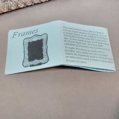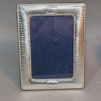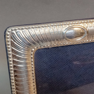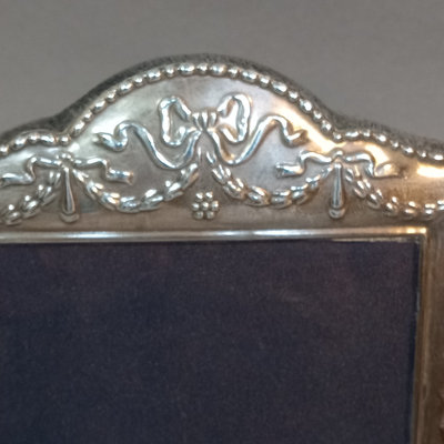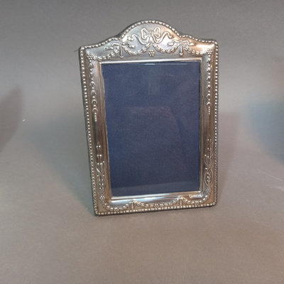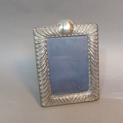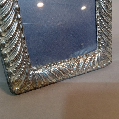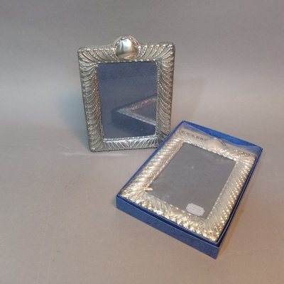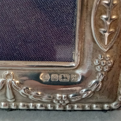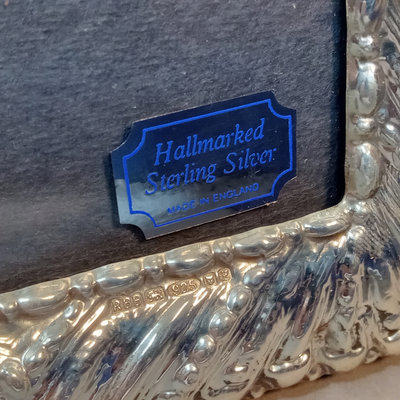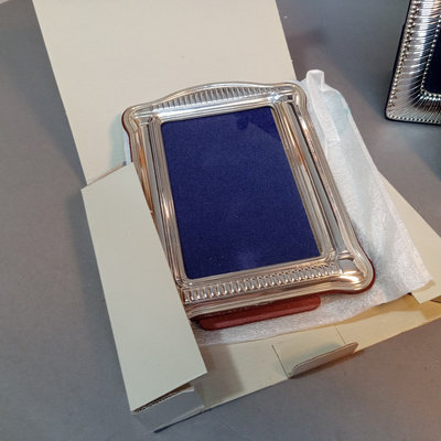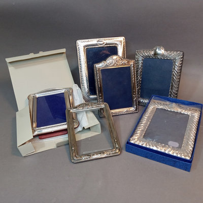 Desktop frames, holds photos 3.5x5.25 to 5.5. Largest holds 3.75x5.75. One is missing back, two are new/unused in original boxes. Most hallmarked, several are not/untested. 6 pieces.