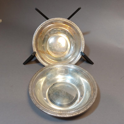Pair of sterling silver No. 306 reticulated edge bon bon dishes or bowls, 5.75d, mark features a Lion climbing on a shield with a cursive L, 112.4dwt overall. 2 pieces.