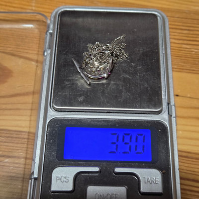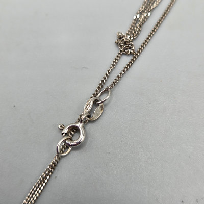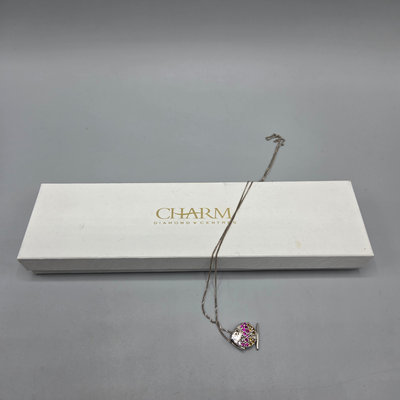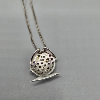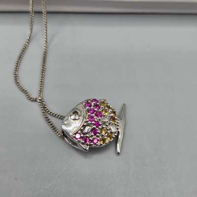 Sterling silver necklace with fish pendant with tiny orange and pink crystals. 18" chain. Pendant is just under 5/8" wide. Both pendant and chain marked 925. Originally from Charm Diamond Centres. Total weight 3.9 grams