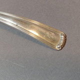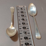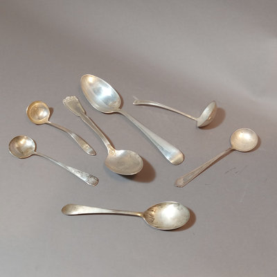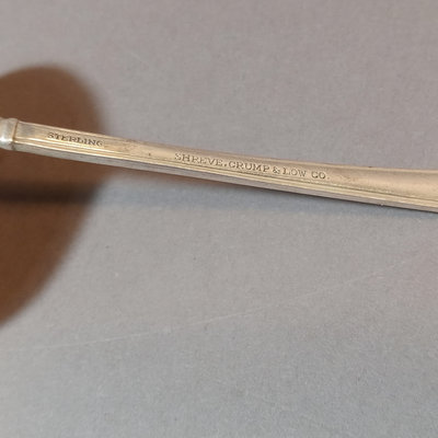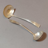 Sterling silver spoons. Lunt serving spoon, "Treasure" pattern, 18.2dwt. Watson Company soup spoons, different patterns, one with monogram on handle, 12.5dwt and 10.5dwt. Ladle with monogram handle from Shreve, Crump, & Low, 22.2dwt. ONC small ladle with monogram, 15.8dwt. Reed & Barton serving spoon, monogram on handle, 40.8dwt. Dominick & Haff serving spoon, 42.1dwt. 7 pieces.