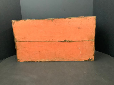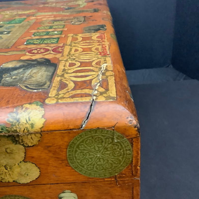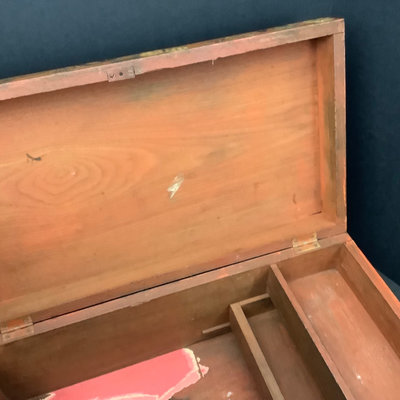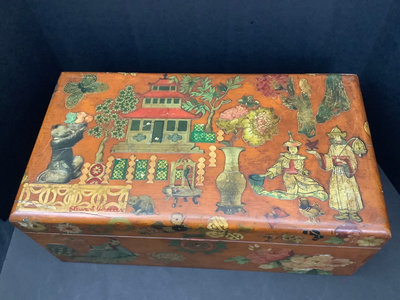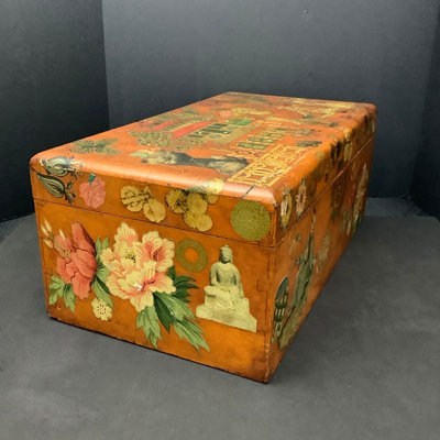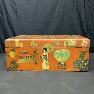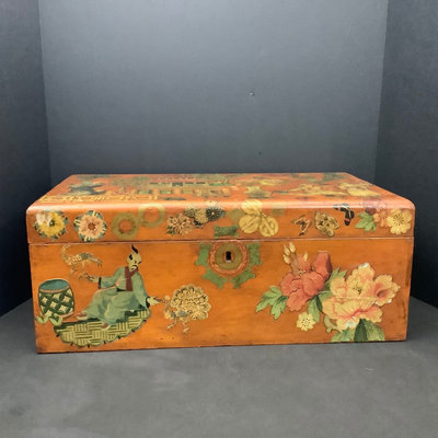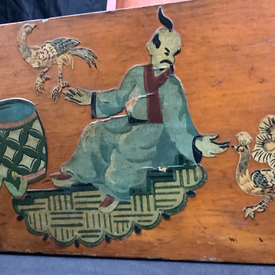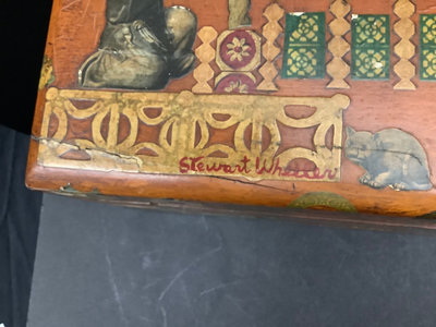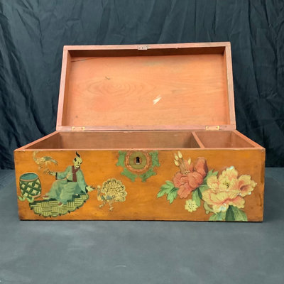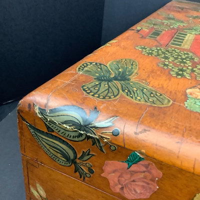 Large Asian themed decoupaged wood treasure box, signed by Stewart Wheeler (American 1906-1975) bottom left of lid, crack in lid near the signature. Includes slide out hidden drawer, no key, 20.75x11.5x8.25. 1 piece.