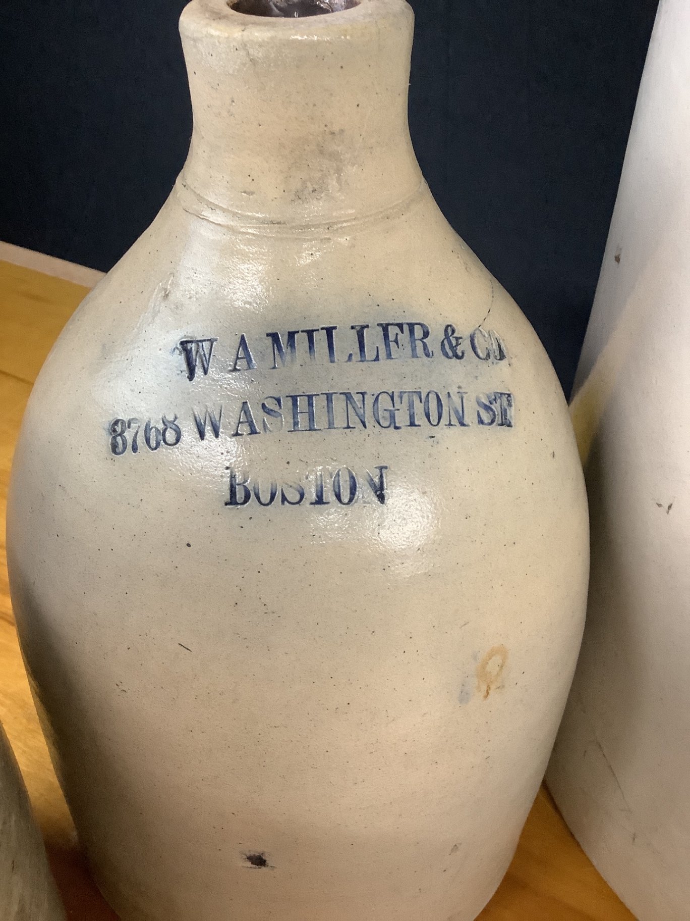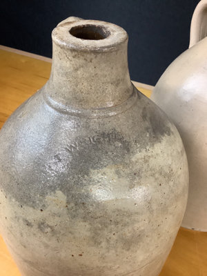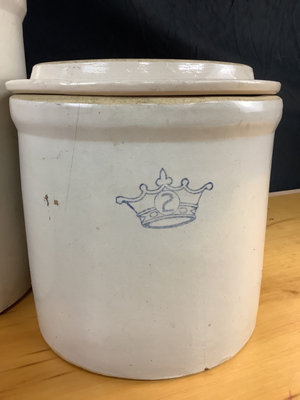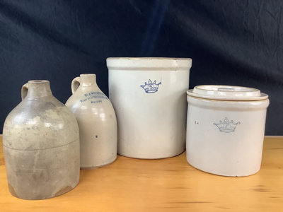 Antique stoneware jugs W. A. Miller & Co and F.T. Wright, no corks. Blue Crown pickling crocks, both have crack emanating from rim, no. 2 one with lid, no. 5 without. 4 pieces.