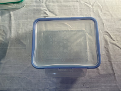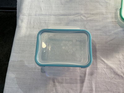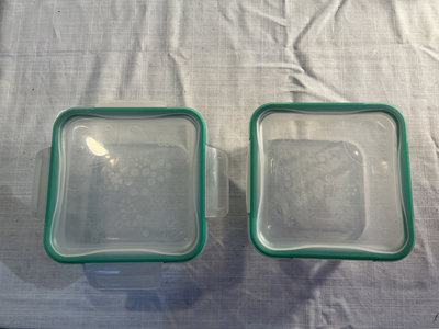 4 Pyrex storage containers with securing lids. 1 two cup size, 2 four cup size and 1 six cup size.
