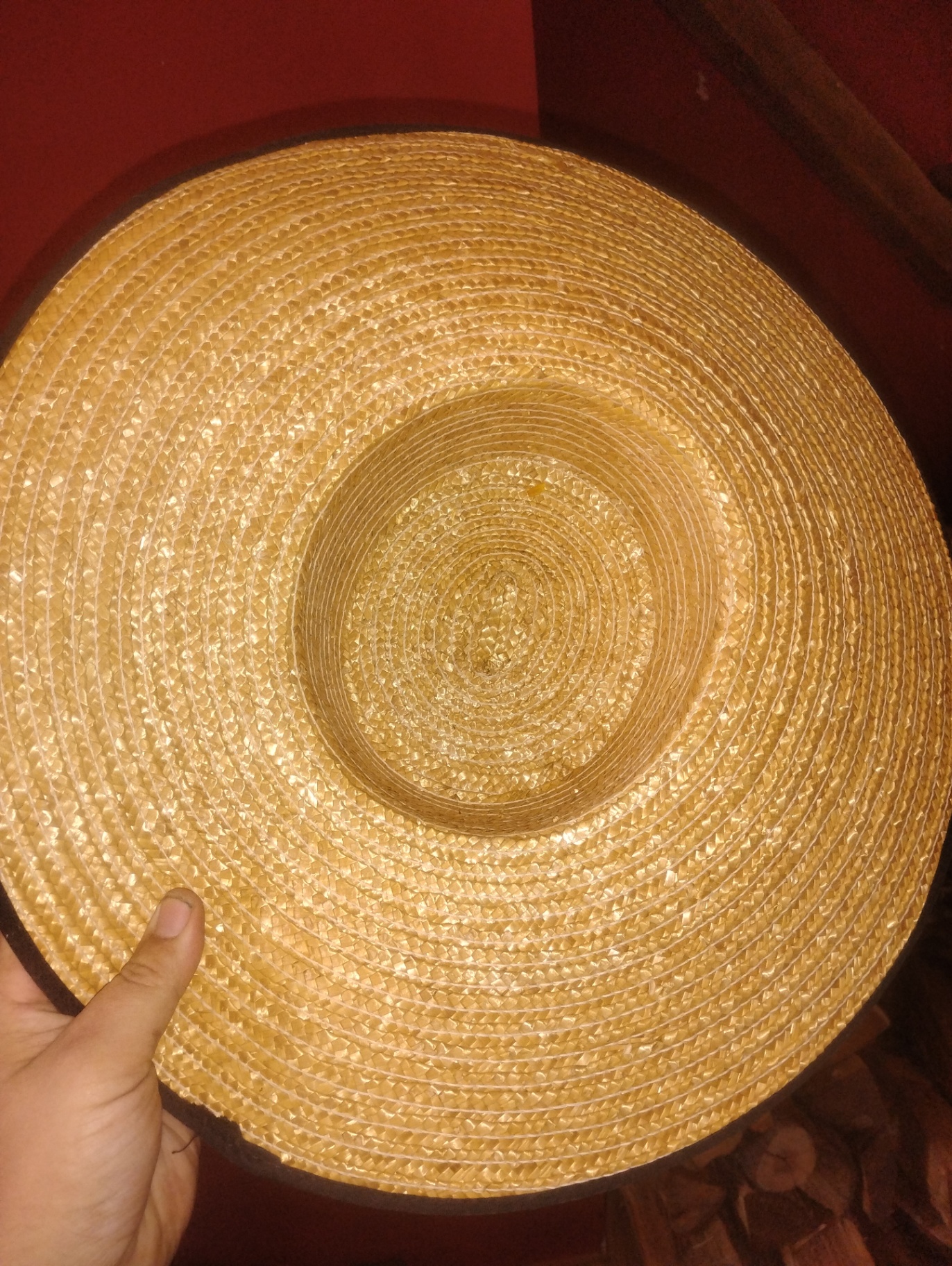 A woven straw sun hat with a wide brim and a black fabric ribbon tied into a bow around the crown.