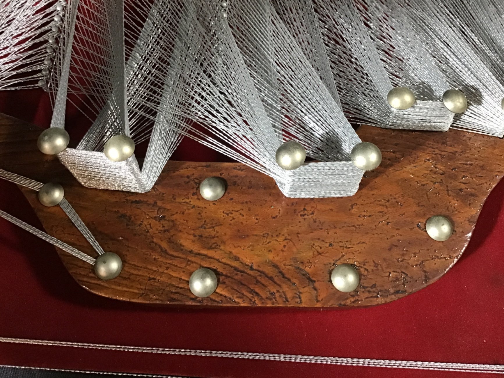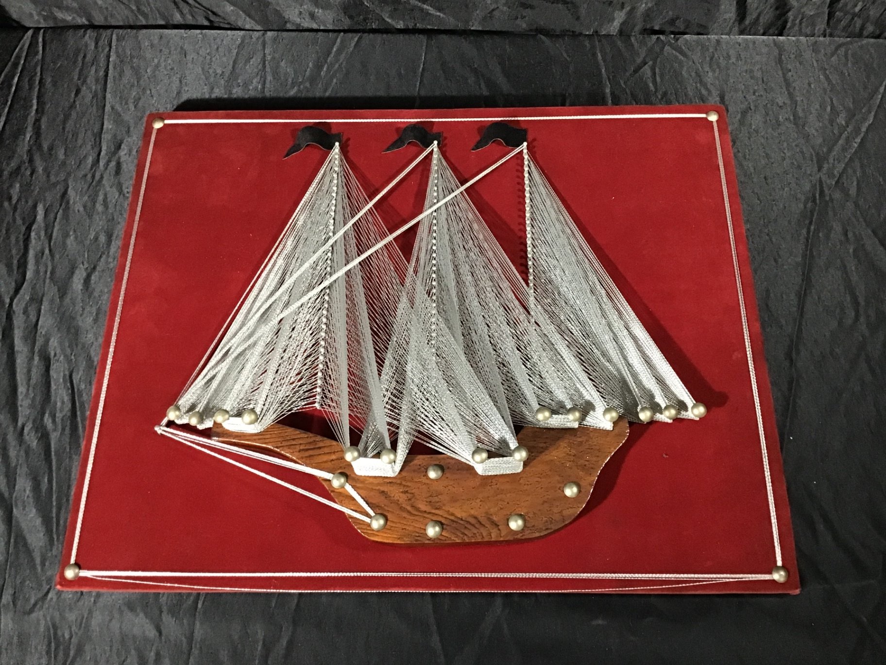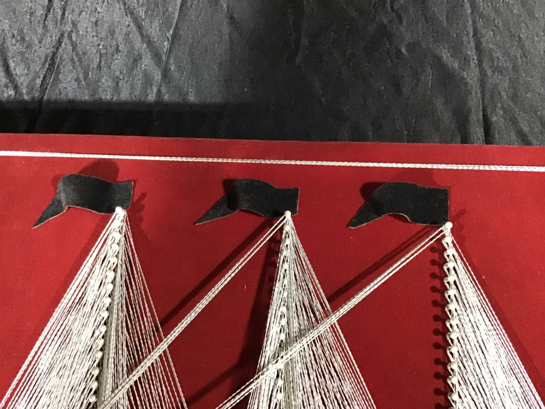 1960s string art sailboat. Backed on solid heavy wood. 20 x 16. 1 piece.