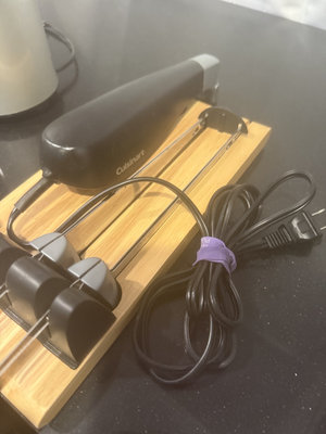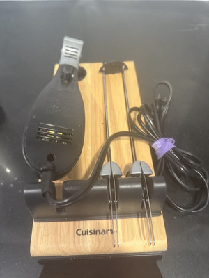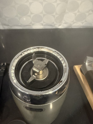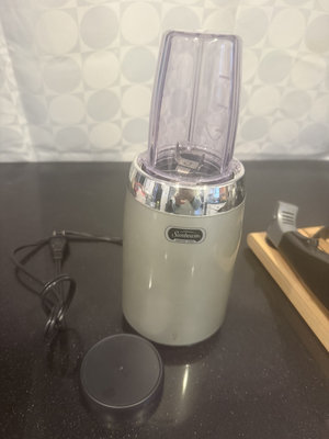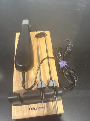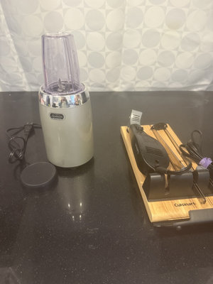 A Sunbeam blender with a purple-tinted blending jar and chrome collar, alongside a Cuisinart handheld immersion blender, a wooden stand, and multiple attachment components with cords.