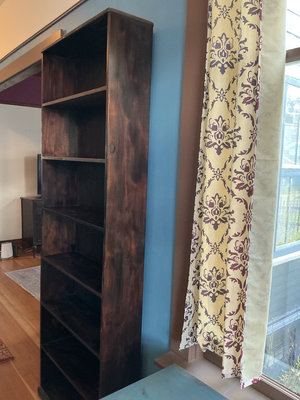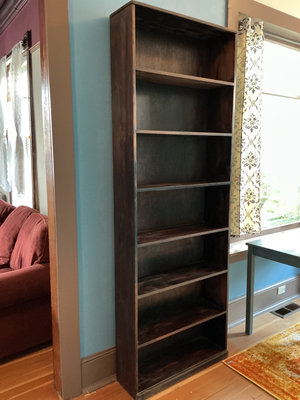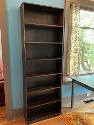 A tall dark wooden bookshelf with multiple fixed shelves. Measurements 30 inches wide by 9 inches deep and 84 inches tall.