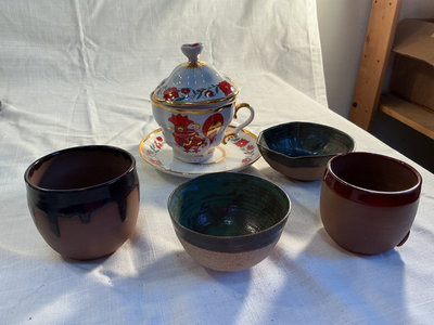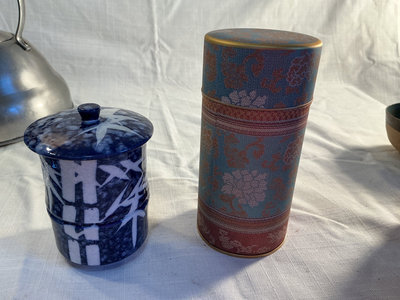 Stainless kettle, 2 presses and infuser, metal and ceramic storage containers, tea cup and saucer and sipping cups.