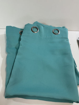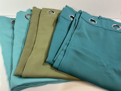 A set of curtain panels in teal and olive green colors with metal grommet top edges, folded and stacked together. 50”x 92”. Included is A collection curtain rods and poles in black, white, and chrome finishes. The items includes extendable spring loaded rods of various sizes, and a set of curved end rod iron pieces 56” long. The pictures for the curtain rods disappeared on us and we had already moved everything up so high in the garage you'll just have to take my word for it.