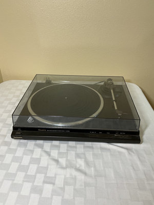 A Technics direct-drive turntable with a clear dust cover, a Yamaha natural-sound stereo receiver, two Bose speakers, and a large collection of compact discs. Tested for power.