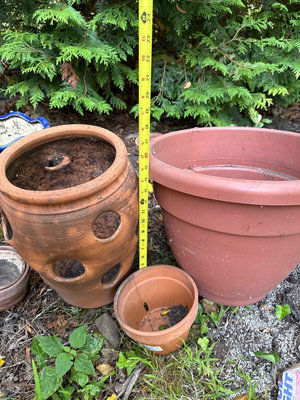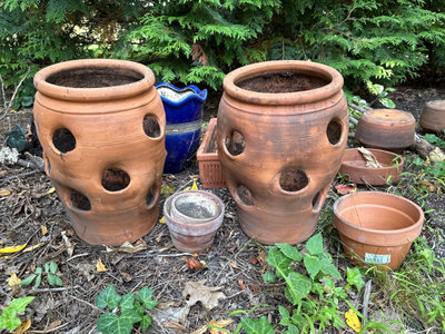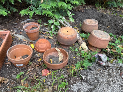 A collection of terracotta plant pots of varying sizes, including several large perforated pots, along with a large blue glazed ceramic planter with a wavy rim. Located in backyard.