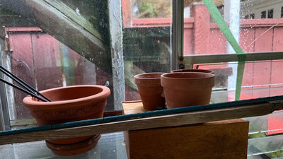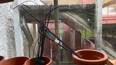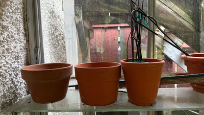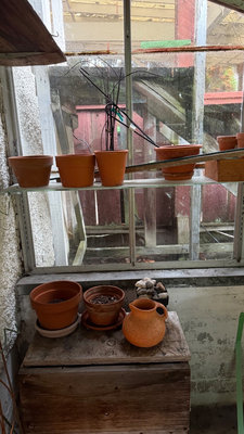 A group of terracotta plant pots of varying sizes, a small clay jug, a tray with stones, a wooden box, and tangled metal plant supports. **BRING OWN PACKING MATERIALS