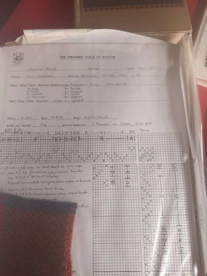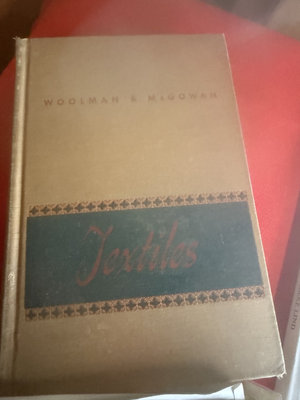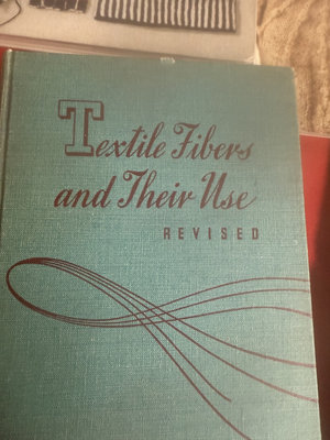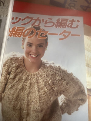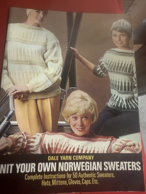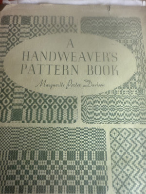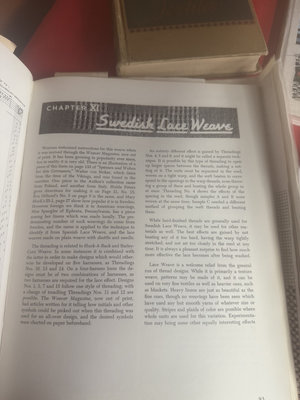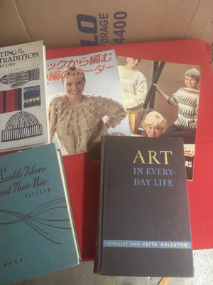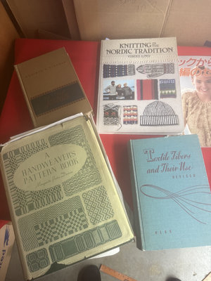 A collection of textile craft books and pattern guides, including handweaving, fiber/textile usage, and knitting pattern books for sweaters and other garments.