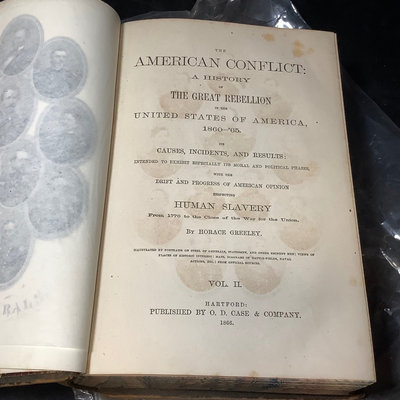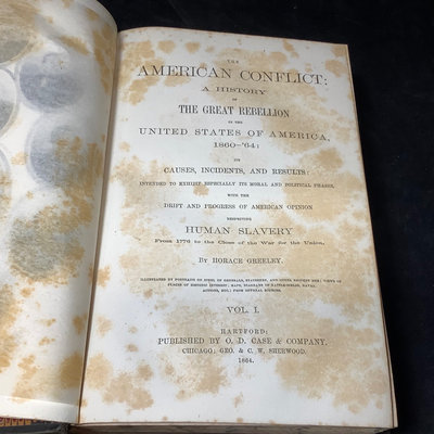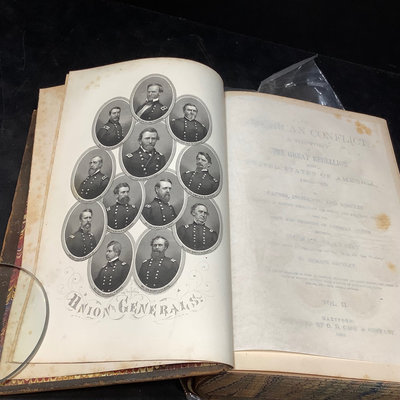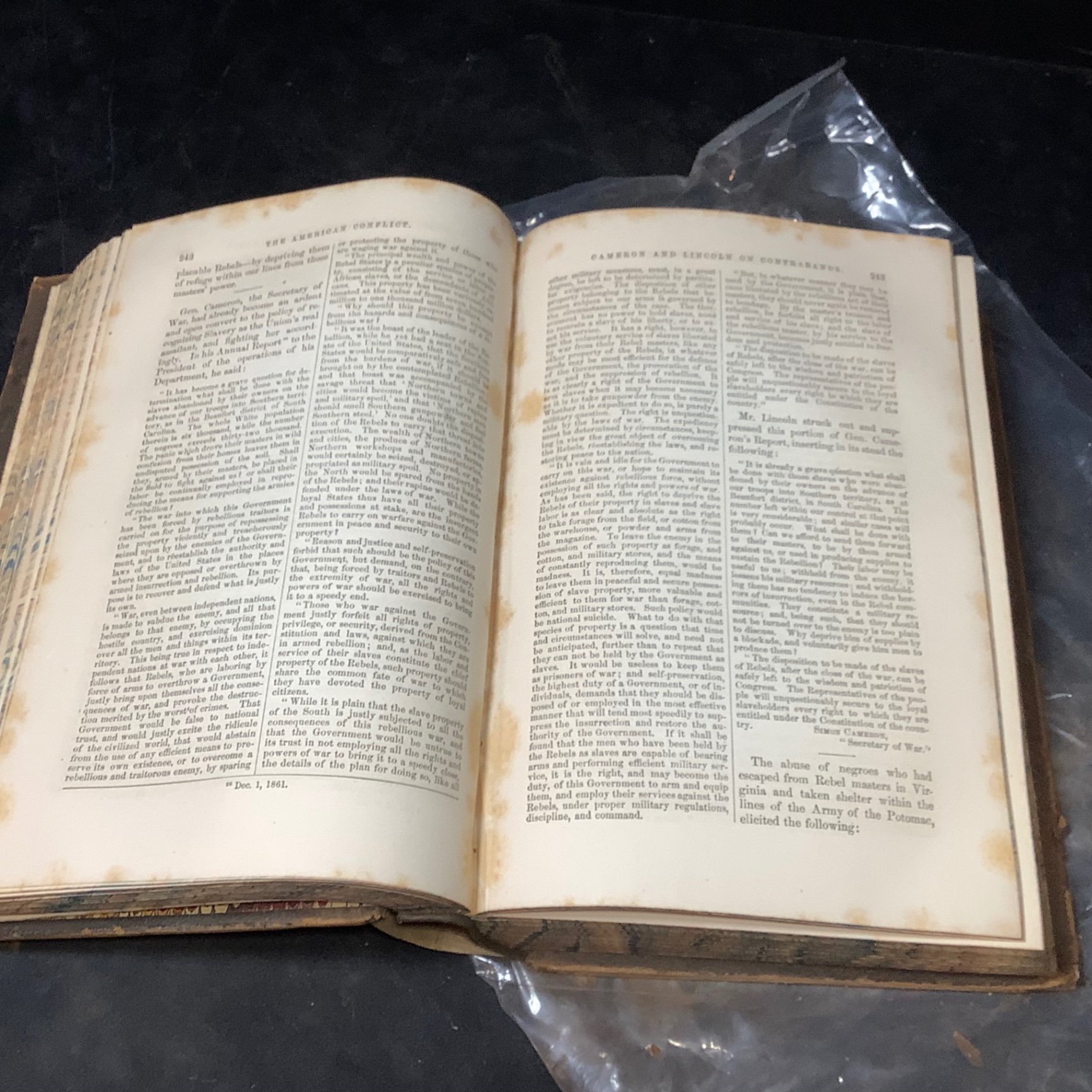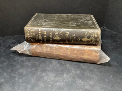 The American Conflict, 2 volumes, Vol 1 1864, Vol II 1866, published by O.D. Case & Co. Dry and brittle, foxing. 6.5x10x2.5. 2 pieces.