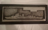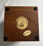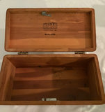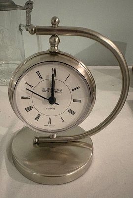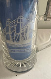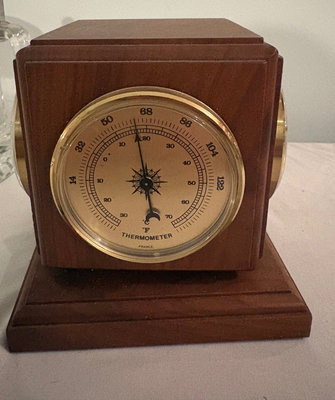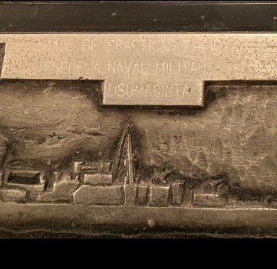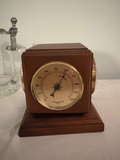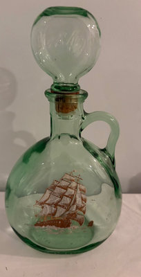 The Captain’s desk and table . Plaque commemorating the naval ship Usumacinta with inscription . A glass trinket dish honoring the ship Statendam. A glass stein with picture and label “ Salem Ship Grand Turk, 1786” A wooden turntable desk weather station. A Kentucky Whiskey brand glass decanter , assorted desk accessories including a jack knife and whimsical sailor miniature figure , a brass captain wall hook and dinner bell, and a magnifying glass. Cedar lined wooden box and 2 plastic Captain tumblers.