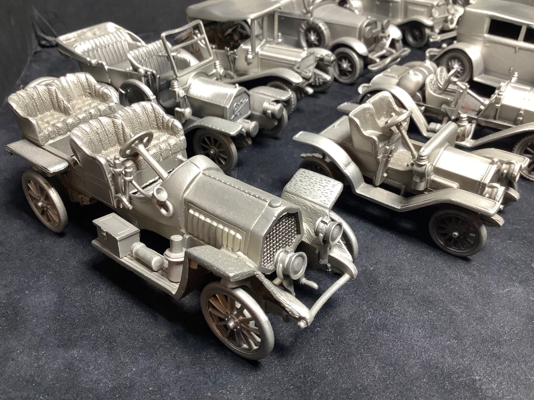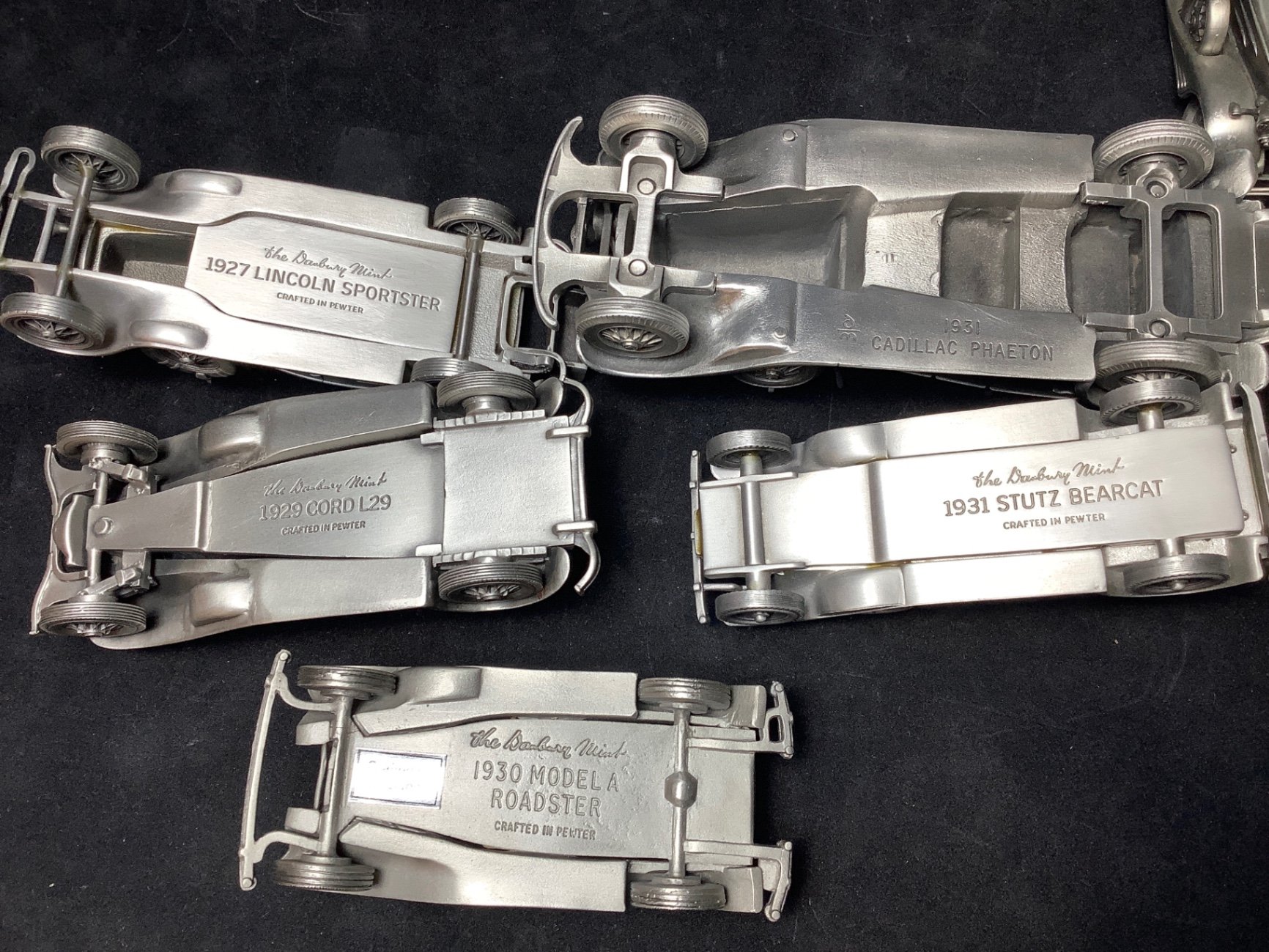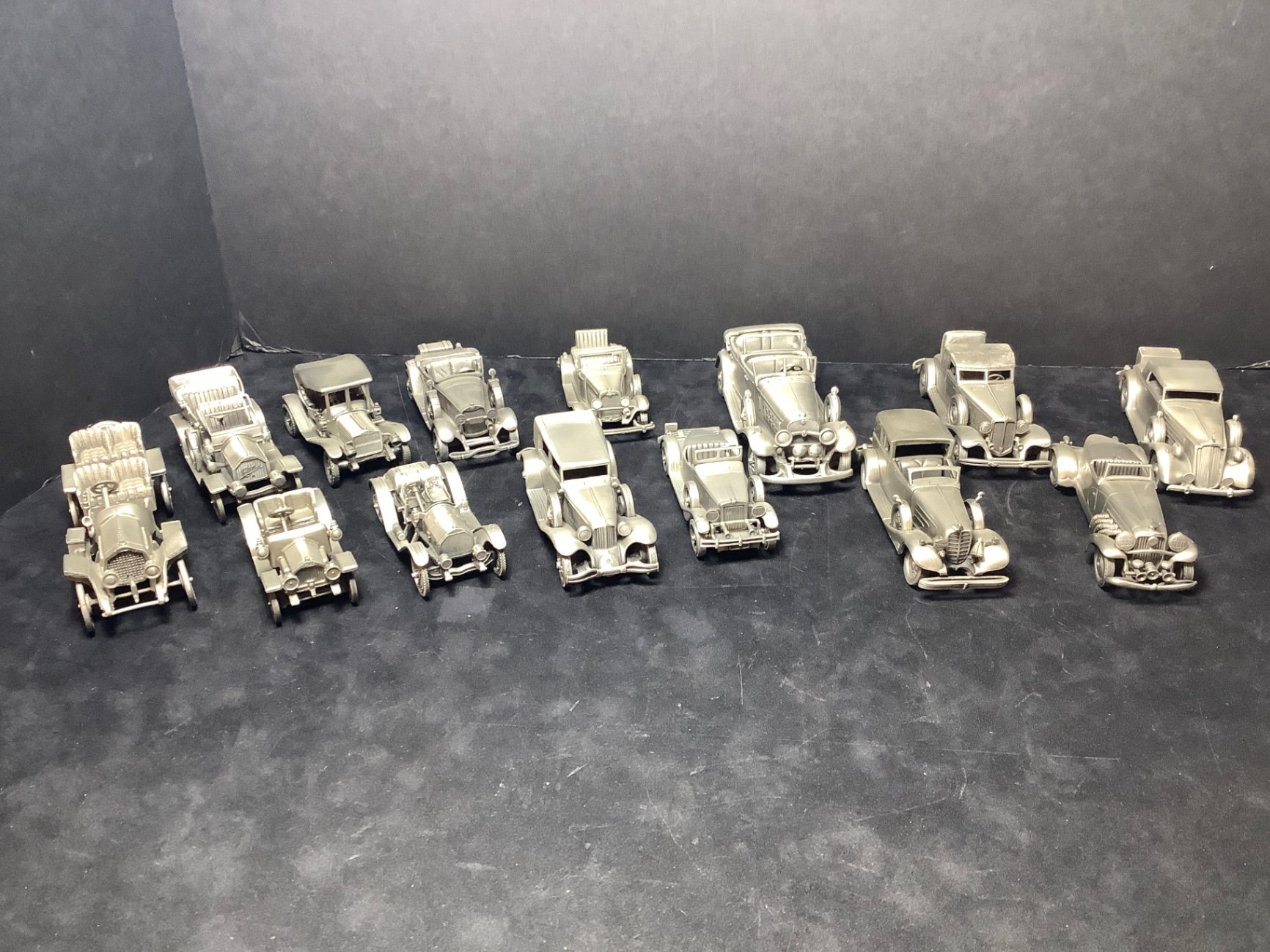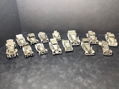 The Danbury Mint classic car collection, 1907-1937, cast in pewter, made in England. 3w to 6w. 14 pieces.