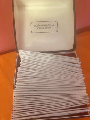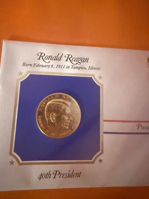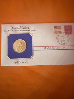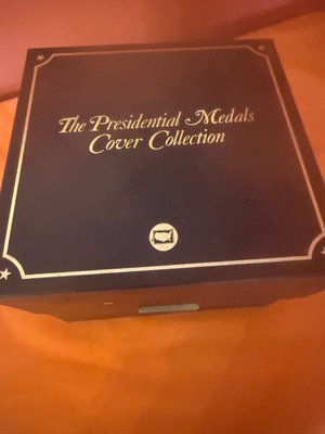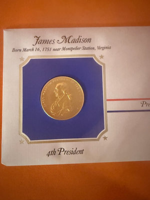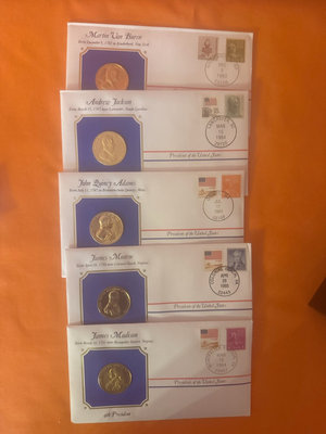A boxed set of six 24k-gold-plated U.S. presidential medals mounted in blue octagonal frames within presentation envelopes. Each envelope is labeled with a president (James Madison, Martin Van Buren, Andrew Jackson, John Quincy Adams, James Monroe, Ronald Reagan) and includes accompanying text and stamps referring to Presidents of the United States. The packaging is titled The Presidential Medals Cover Collection and includes additional informational sheets about the medals.