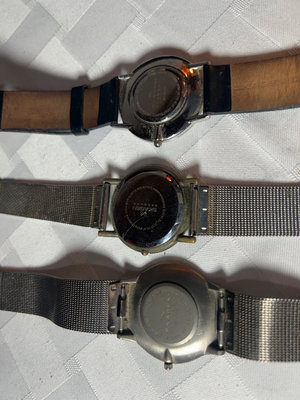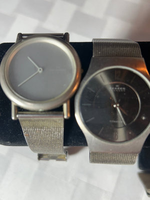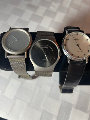One with a leather band, the other two are metal. Will need new batteries. More info on Skagen watches here: https://www.skagen.com/en-us/