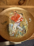 Three round porcelain plates with gold-toned backgrounds featuring Edna Hibel hand-painted scenes for Rosenthal's Classic Rose Collection (Germany). Each plate is marked Rosenthal Group Germany and 'Edition Limited to 2000' with individual numbers. The scenes depict figures with children in outdoor settings, bordered with decorative gold patterns. A metal hanger attachment is on the back, and a price/QR tag is included.