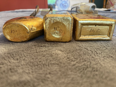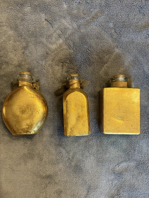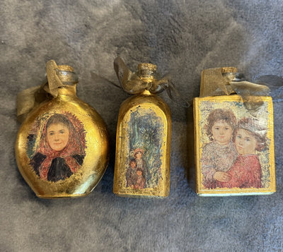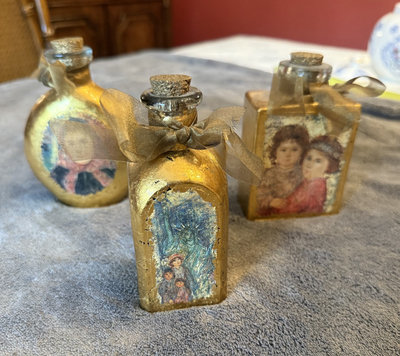 A trio of small, gold-painted decoupage bottles with cork stoppers and ribbon accents, each displaying a religious image on the front. 4-5" high, 2-3" width