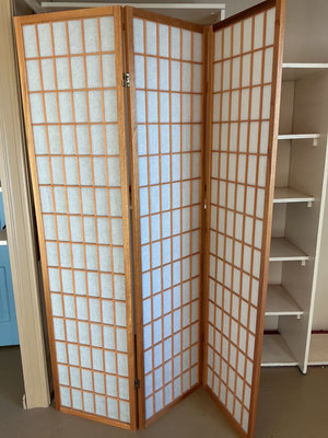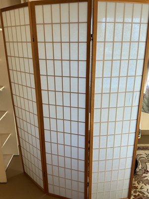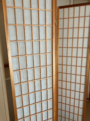 A three-panel wooden folding screen with grid-lattice frames and light paper panels. One panel has an area of damage to the paperand some green splattered paint. Each of the three panels is 17 inches wide and 70.5 inches tall.
