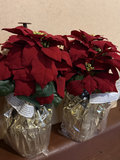 A group of three red poinsettia plants with green leaves, each in a small pot and wrapped in clear plastic.