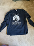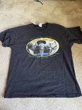 A collection of The Three Stooges memorabilia, including multiple graphic T-shirts with Stooge-themed designs (Knuckleheads, NYUK University, and other images), a framed photograph, several boxed collectibles and packaging, and a cap.