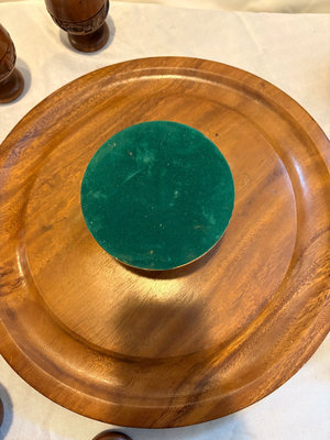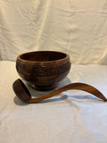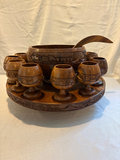 Hand carved wooden punch bowl set with lazy Susan tray , 12 goblet style cups and ladle. This was made in the Phillipines.