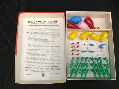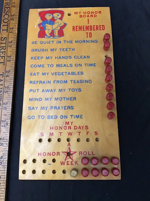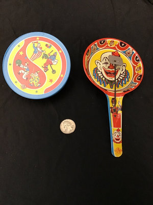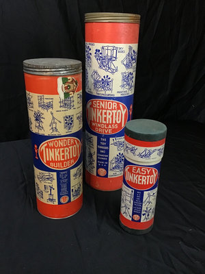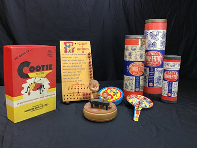 Three tins of Tinker Toys. Anri Italian music box from 1968. Wood honor board with pegs. Tin noise makers. 8 pieces.