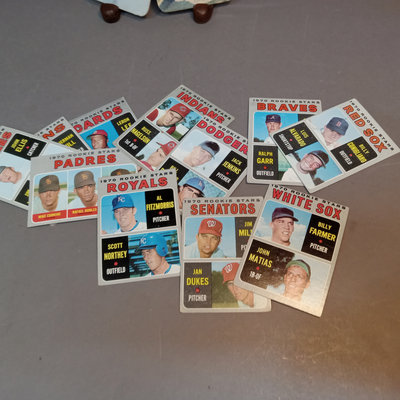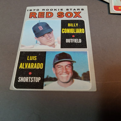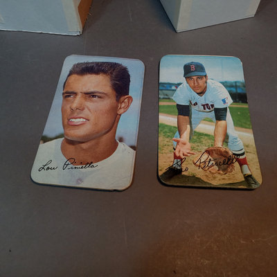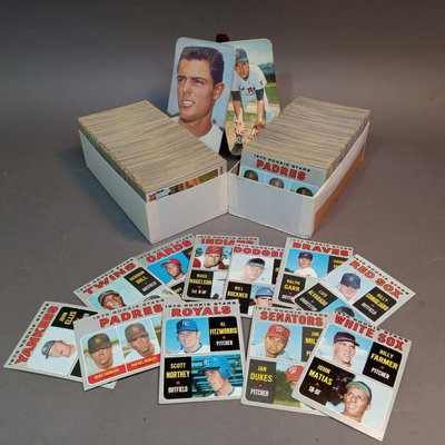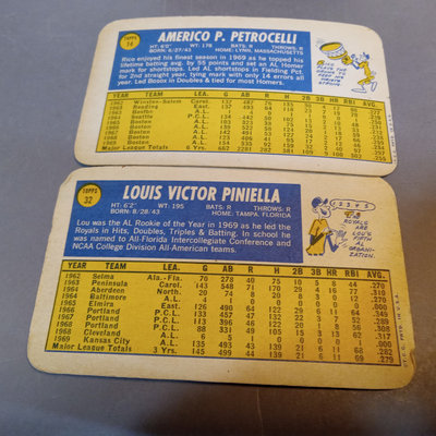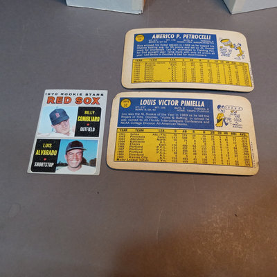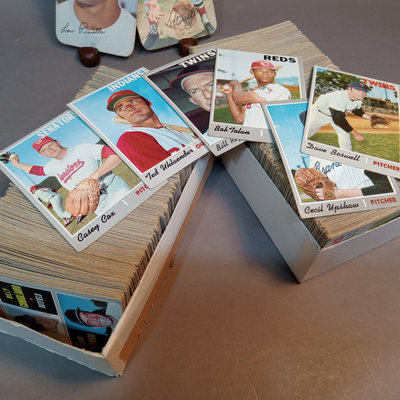 Topps Baseball trading cards from 1970 in two boxes with two larger cards. Uncounted/unsorted, may not include entire series, but will contain duplicates. Condition varies, from bent corners to like-new on visible examination. 4 pieces.